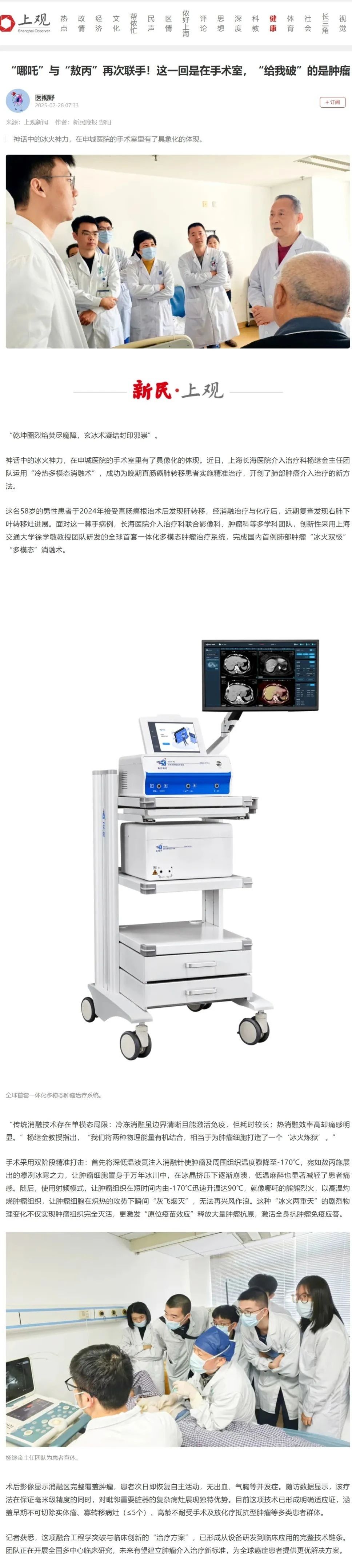 据“上观新闻”“医视野”栏目2月28日报道:近日,上海长海医院介入治疗科杨继金主任团队成功应用全球首创的多模态肿瘤治疗系统,以“冰火神力”双阶段精准打击肿瘤,成功为一位晚期直肠癌肺转移患者实施了精准治疗,开创了肺部肿瘤介入治疗的新方案。