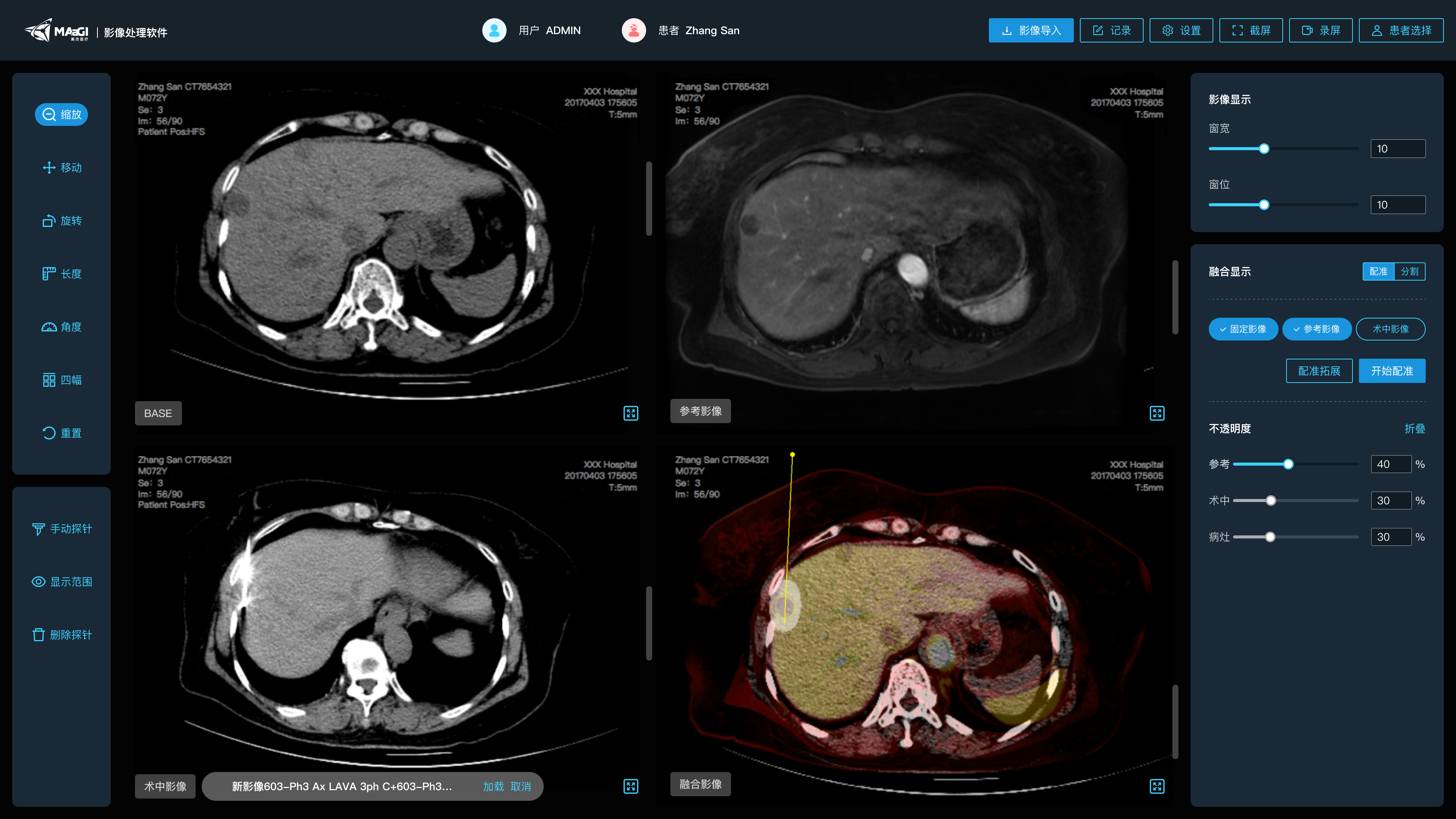 IMAGE-P1软件具备对符合DICOM 3.0标准的CT、MR医学影像进行显示、影像分割、融合以及多平面重建(MPR),可实现影像分割、同模态影像配准、跨模态影像配准、MPR重建等功能。相比传统治疗过程中医生需要在不同显示器中反复比对患者历史MR影像与术中CT的方式,该软件能够快速、高精度地实现跨模态影像配准融合,极大地辅助医护人员在术前、术中和术后对影像资料进行精确分析和管理,从而满足术前虚拟探针辅助穿刺路径的选择,术中治疗靶区实时监控助力精准治疗,术后多组学联合分析,精准评估治疗效果等临床需求。